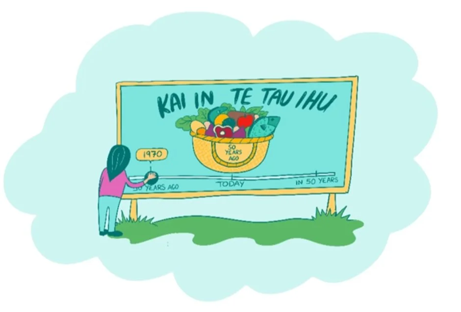 Another beautiful piece drawn by Yasmin is Tūrehu. An interactive billboard that shows how abundant our baskets are now, compared to how scarce produce could be in the future.