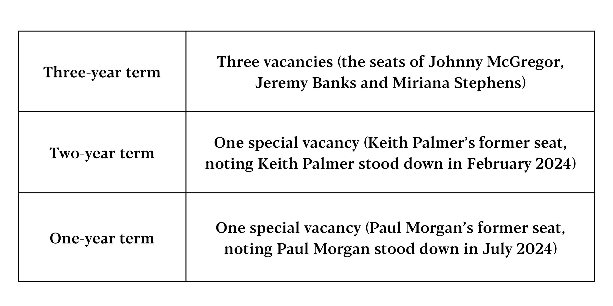 In addition to these three seats available by rotation, this year there are also two vacated seats or ‘special vacancies’. These have modified terms with the balance of the original three-year term to be served.